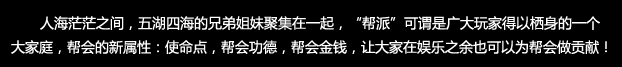 为了丰富大家帮会的业余生活,特意增加了帮会的新属性:使命点,帮会功德,帮会金钱,当然随着新属性也连带的增加的新的玩法,让大家可以在娱乐之余也可以为帮会做贡献。一举两得,何乐而不为!