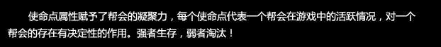 每月的15号和月底的最后一天对使命点数进行统计,统计完毕后,使命点请0。当使命点小于标准使命点时,帮会降级,没有降级的将给予帮会经验的奖励!